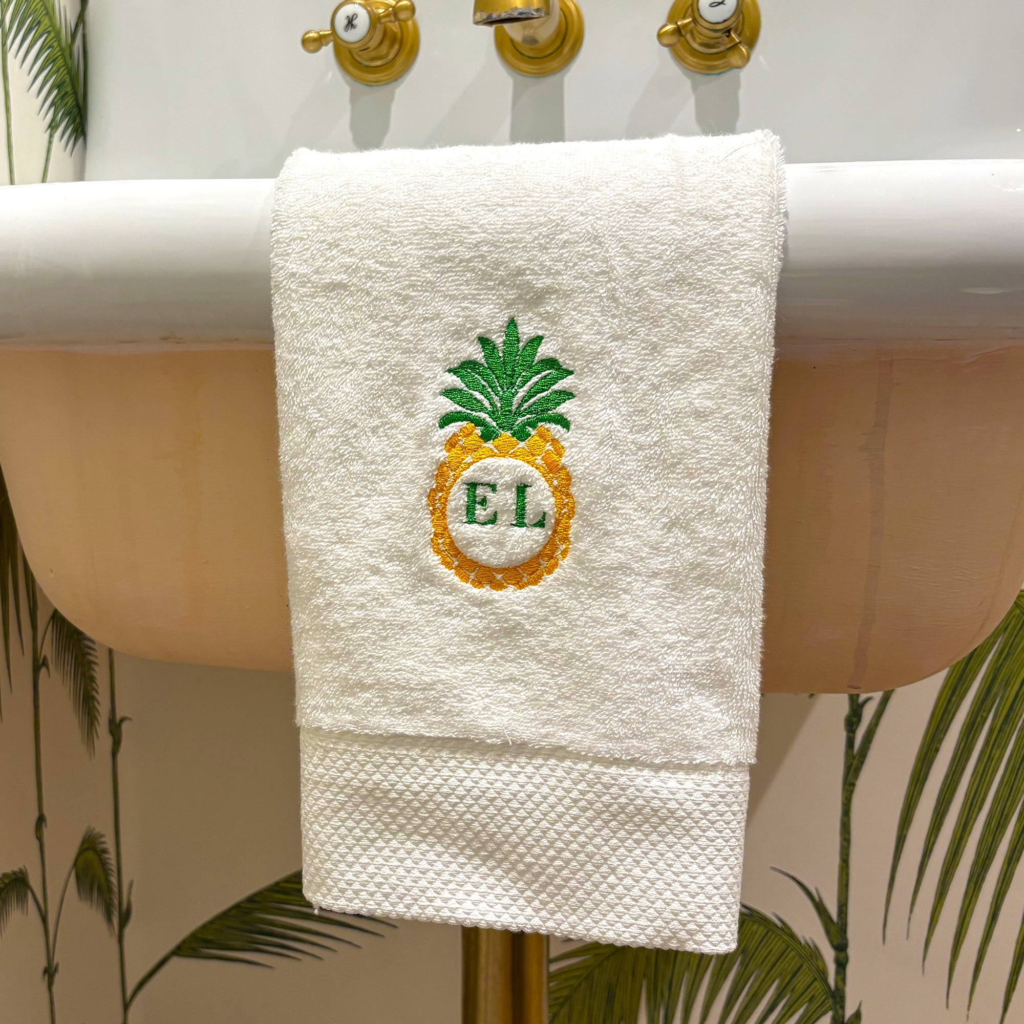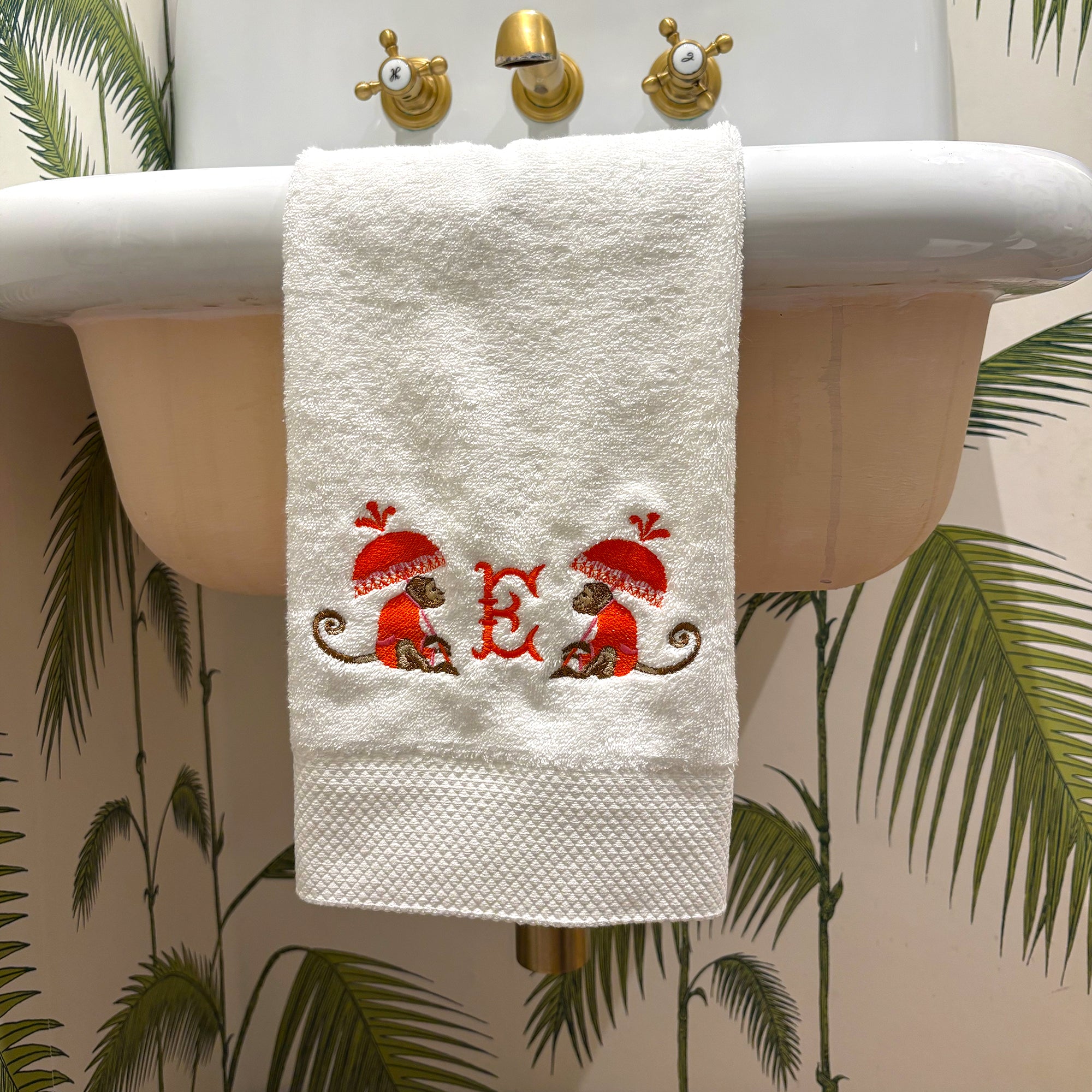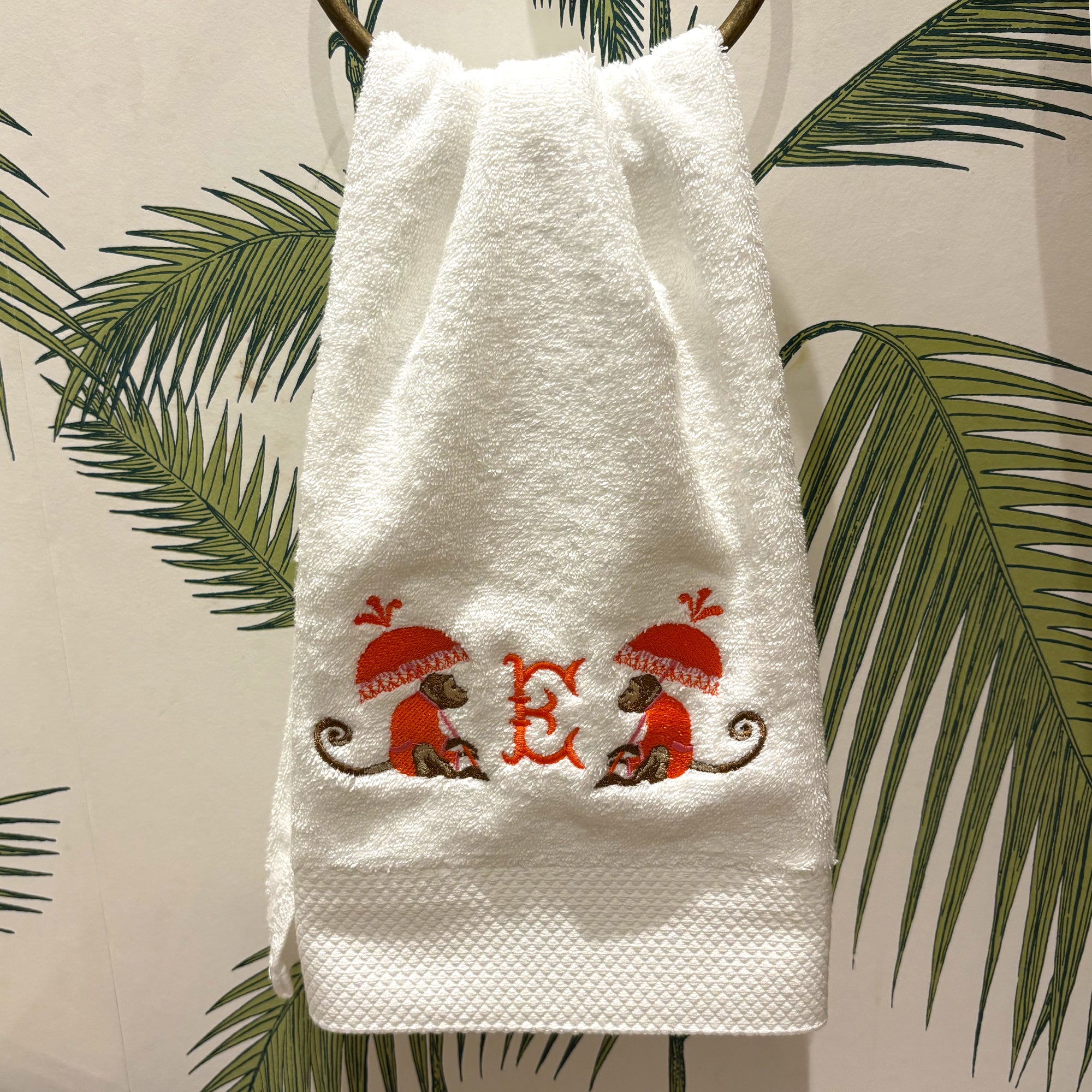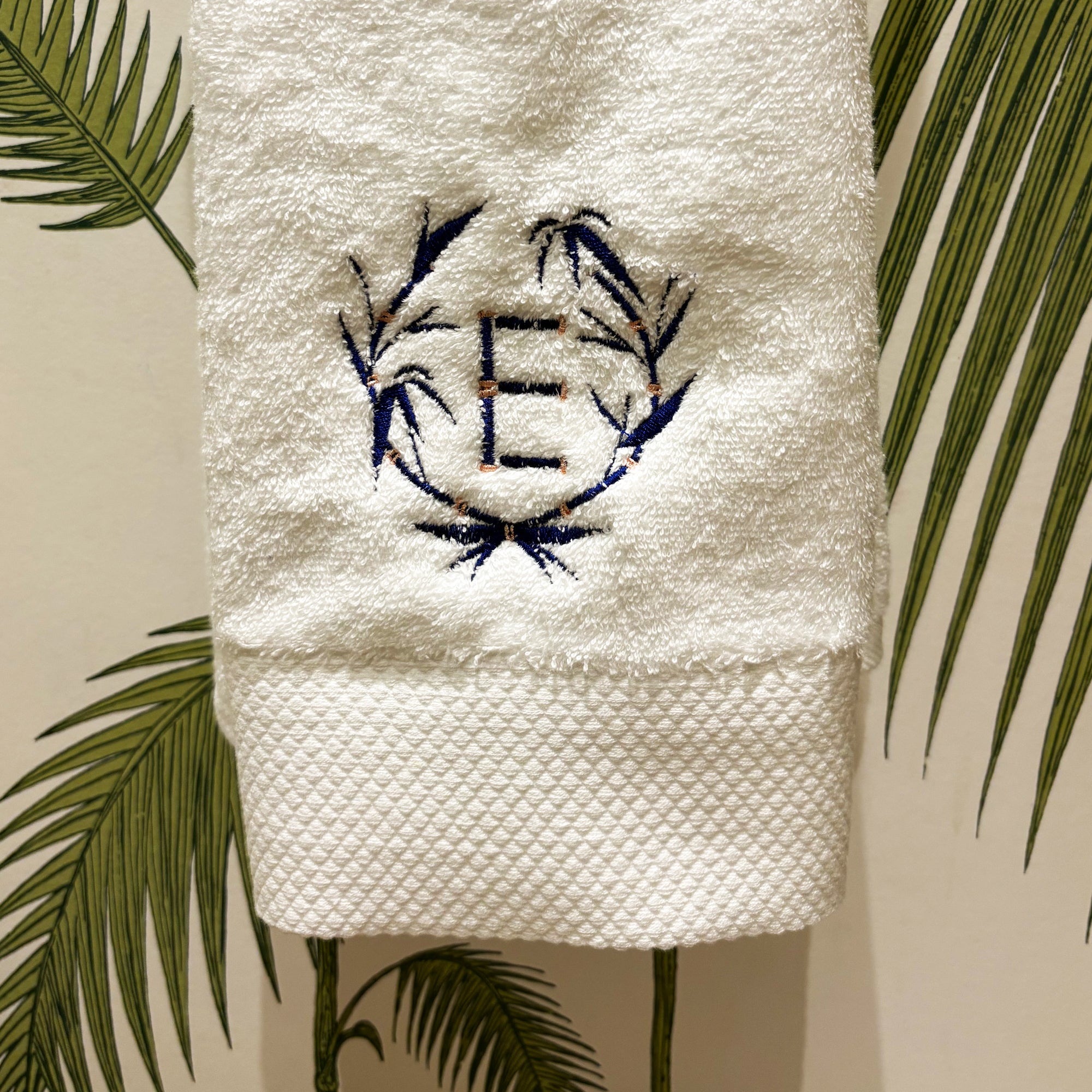 The embroidered design on the photo is Two Monogrammed Letters embroidered on the corner, we can add more and change font.