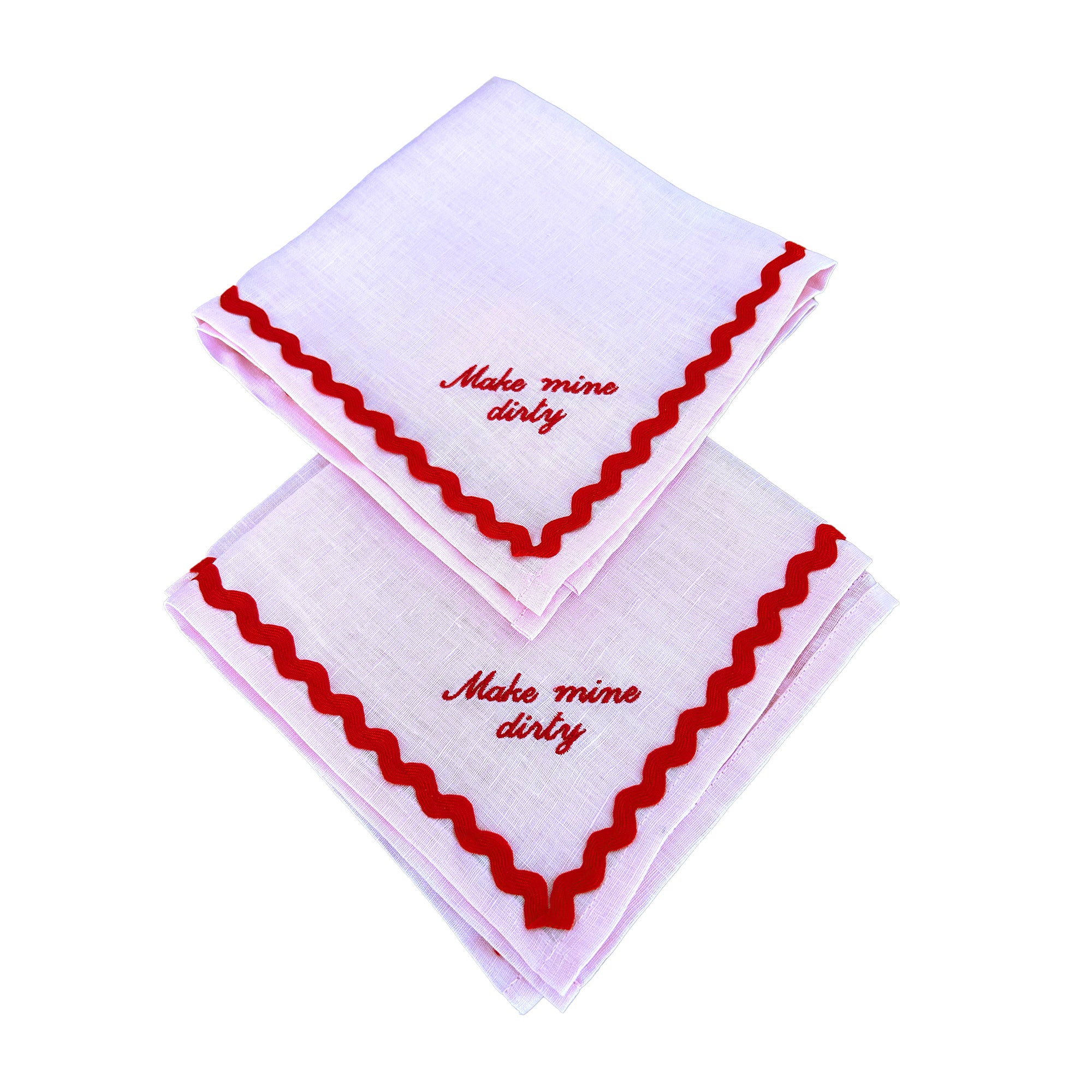 Add a touch of humor and vintage charm to your dinner parties with this embroidered "Make Mine Dirty" housewarming napkin set! Each 100% linen napkin features the cheeky phrase exquisitely embroidered along with decorative rick rack trim. A perfect mix of vintage and playful styles. Ideal for casual entertaining or a clever housewarming gift. The all-natural linen fabric lends a soft, absorbent texture.