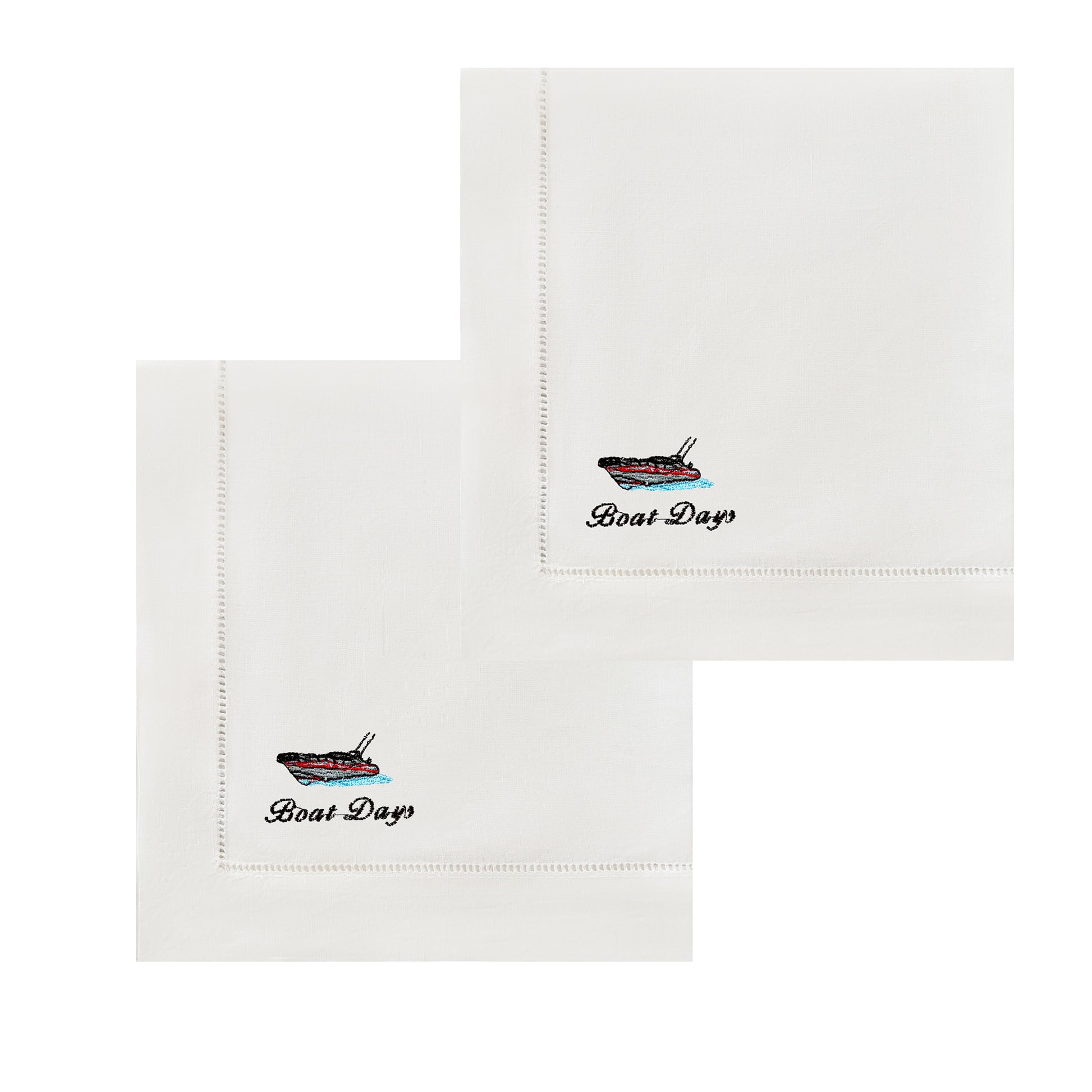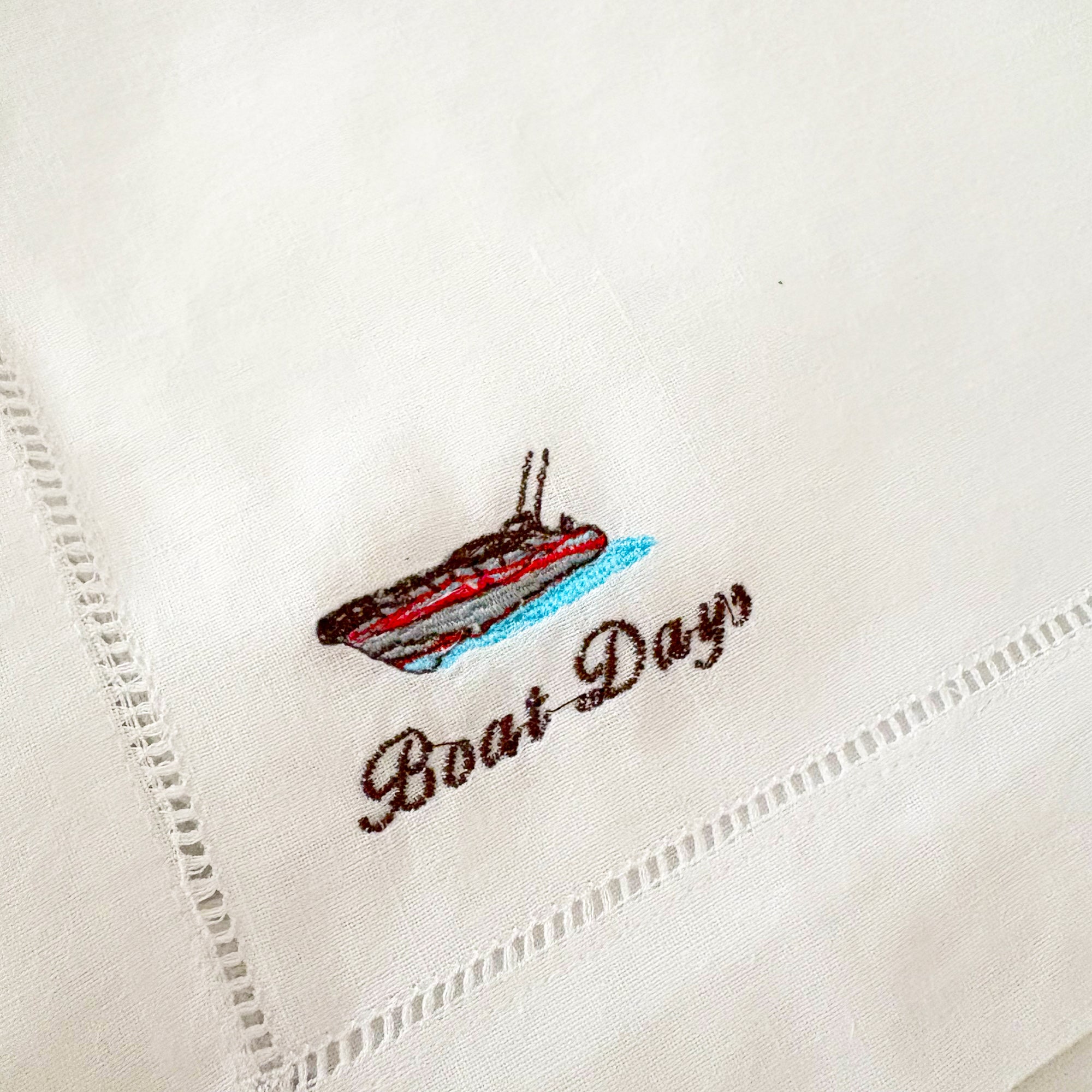 Add a unique and thoughtful touch to your home decor or entertaining essentials with this set of embroidered reusable boat themed napkins! Add your own text and make it personal. Perfect for adding some personal flair and easy elegance to any occasion. These cocktail napkins are made from soft, absorbent cotton with a linen-like texture that is both durable and eco-friendly. At 40 x 40 cm, they are just the right size for any dinner party, cleaning up spills.