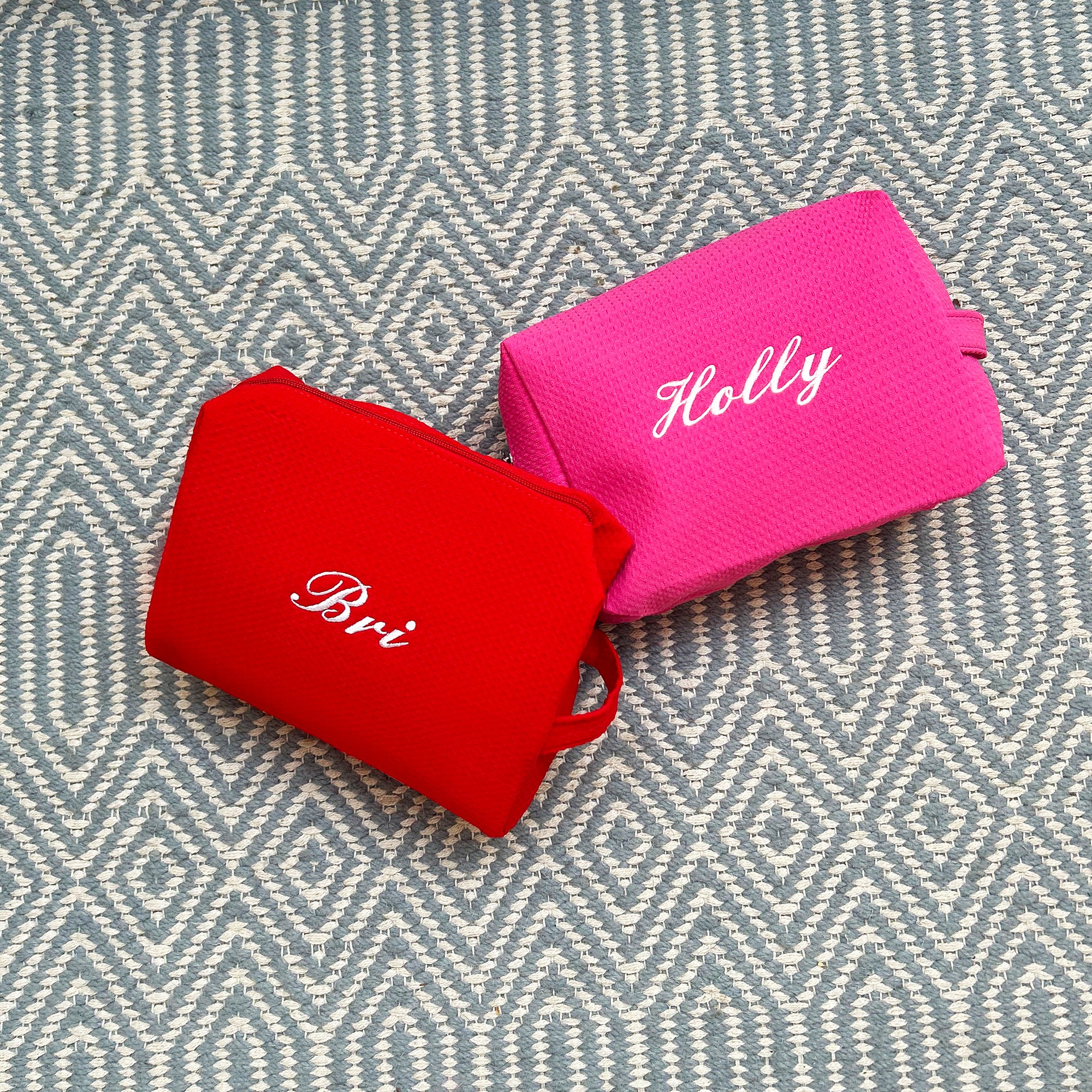 Embroidered Monogramed Waffle cosmetic bag stitched in our London based studio.
