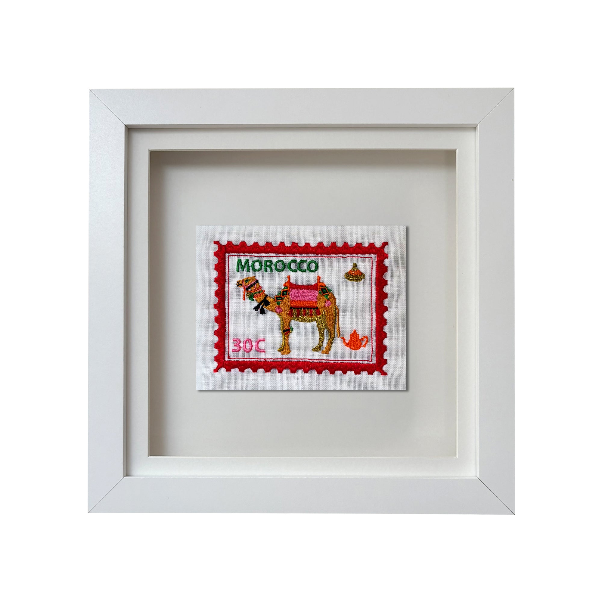 I wanted to create a range of unique embroidered stamps from all over the world, inspired by Morocco; these are bright and fun with a playful twist. We stitch all of these in our London studio and use beautiful floating frames.