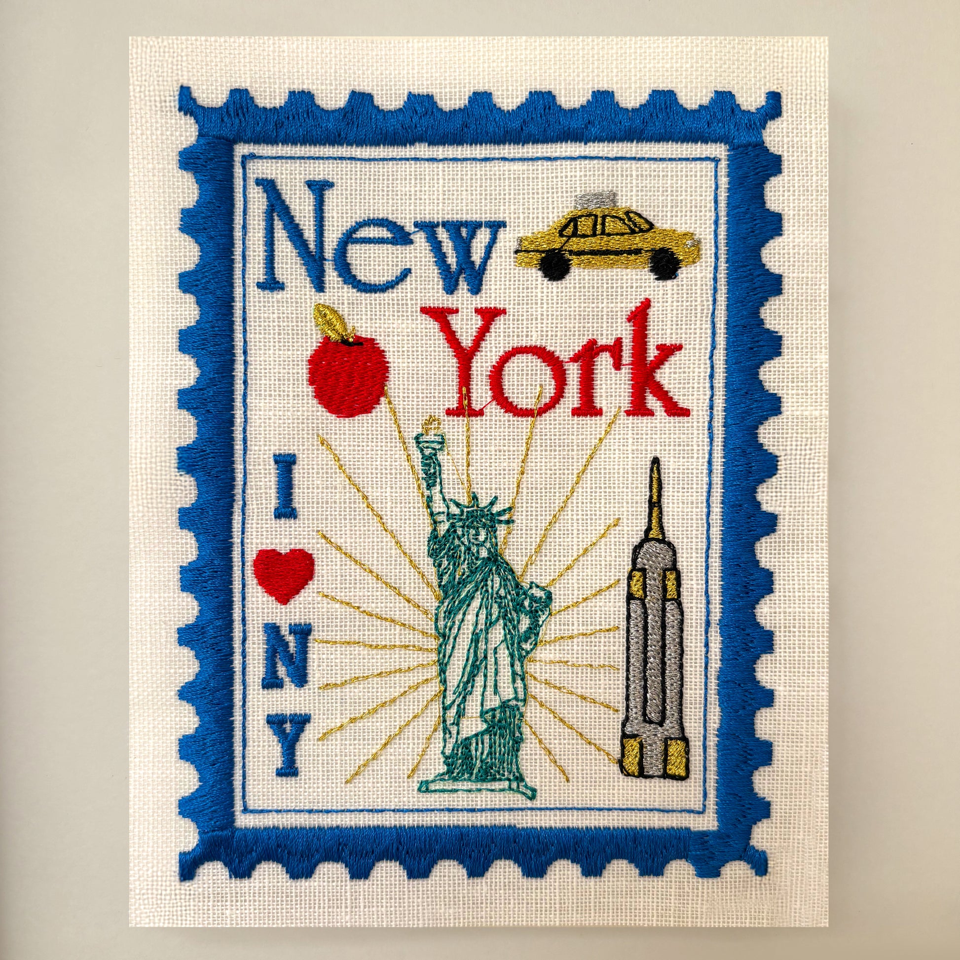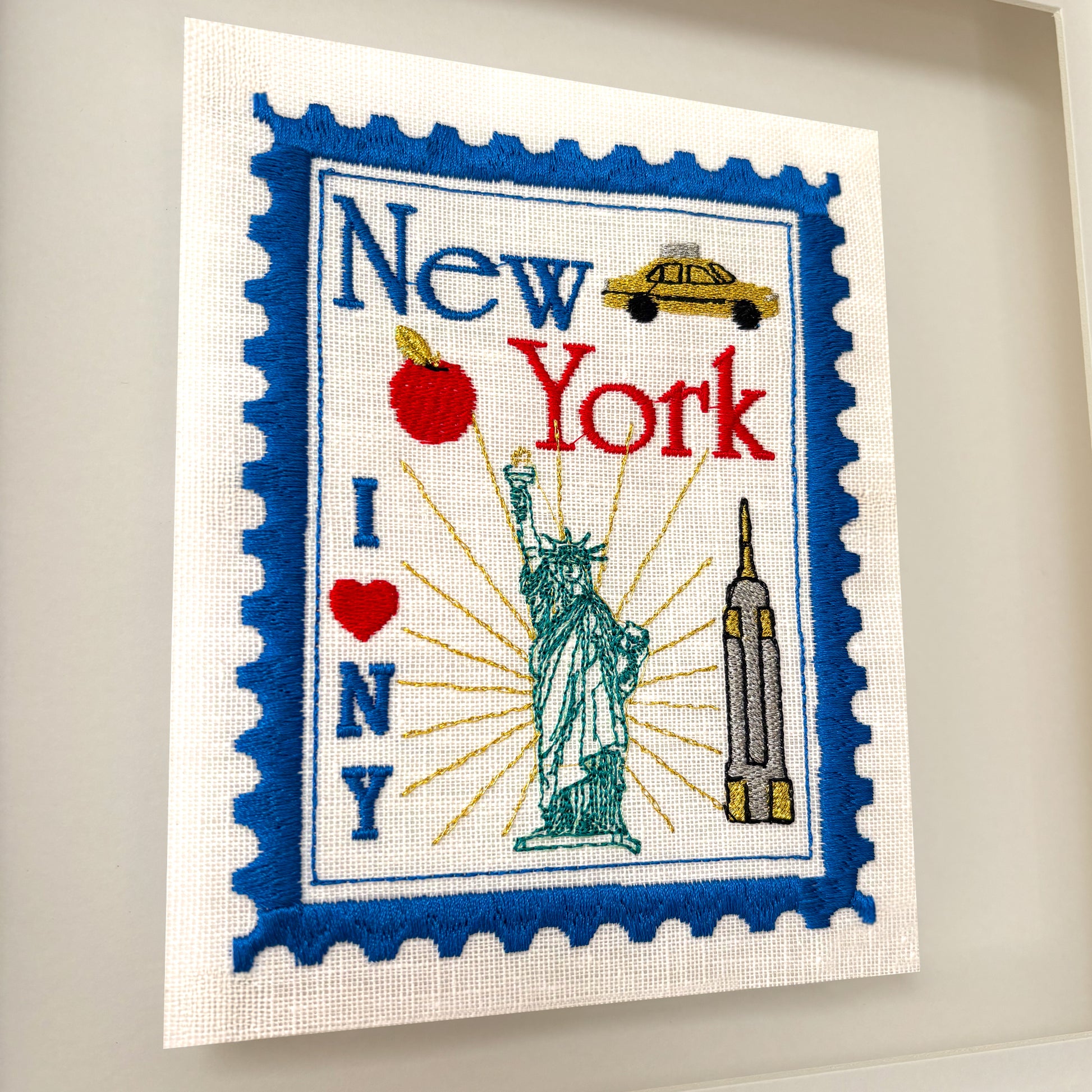 I wanted to create a range of unique embroidered stamps from all over the world, inspired by one of my favourite cities New York; these are bright and fun with a playful twist. We stitch all of these in our London studio and use beautiful floating frames.