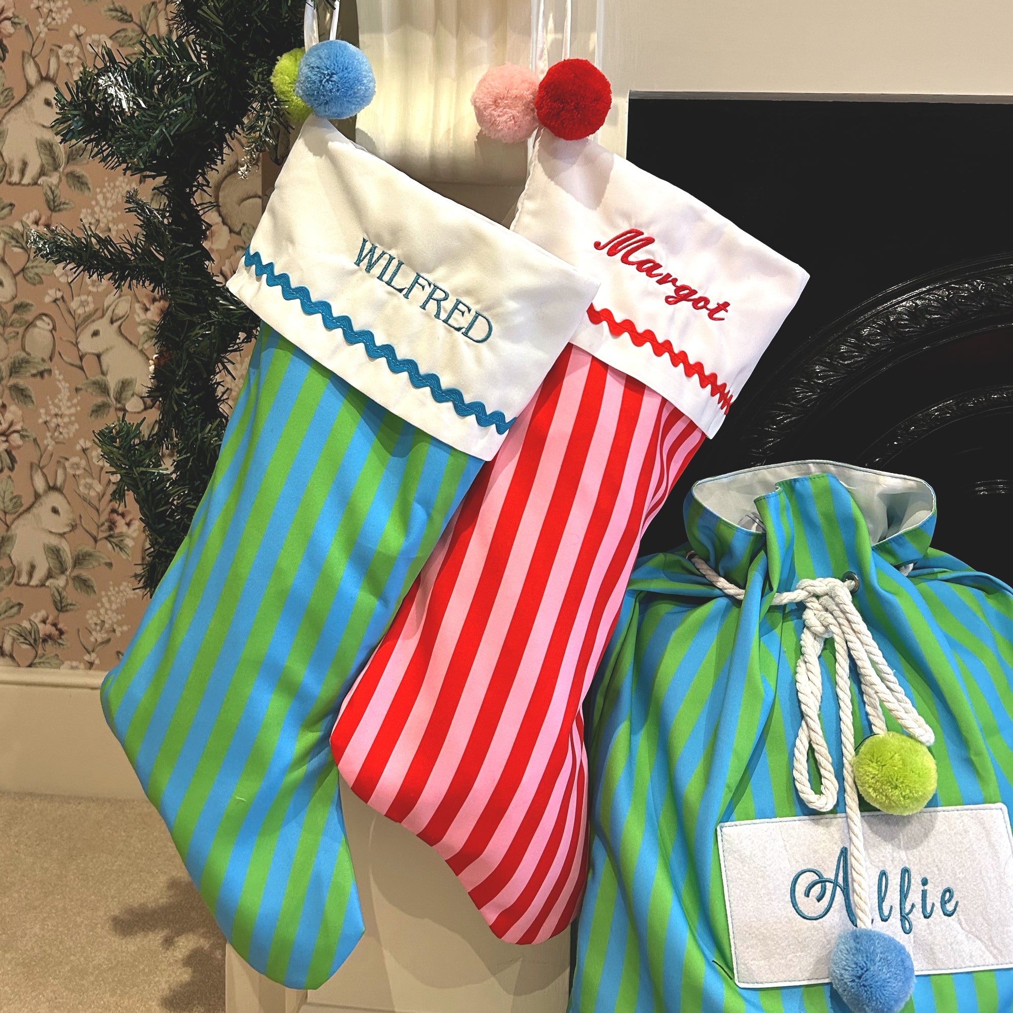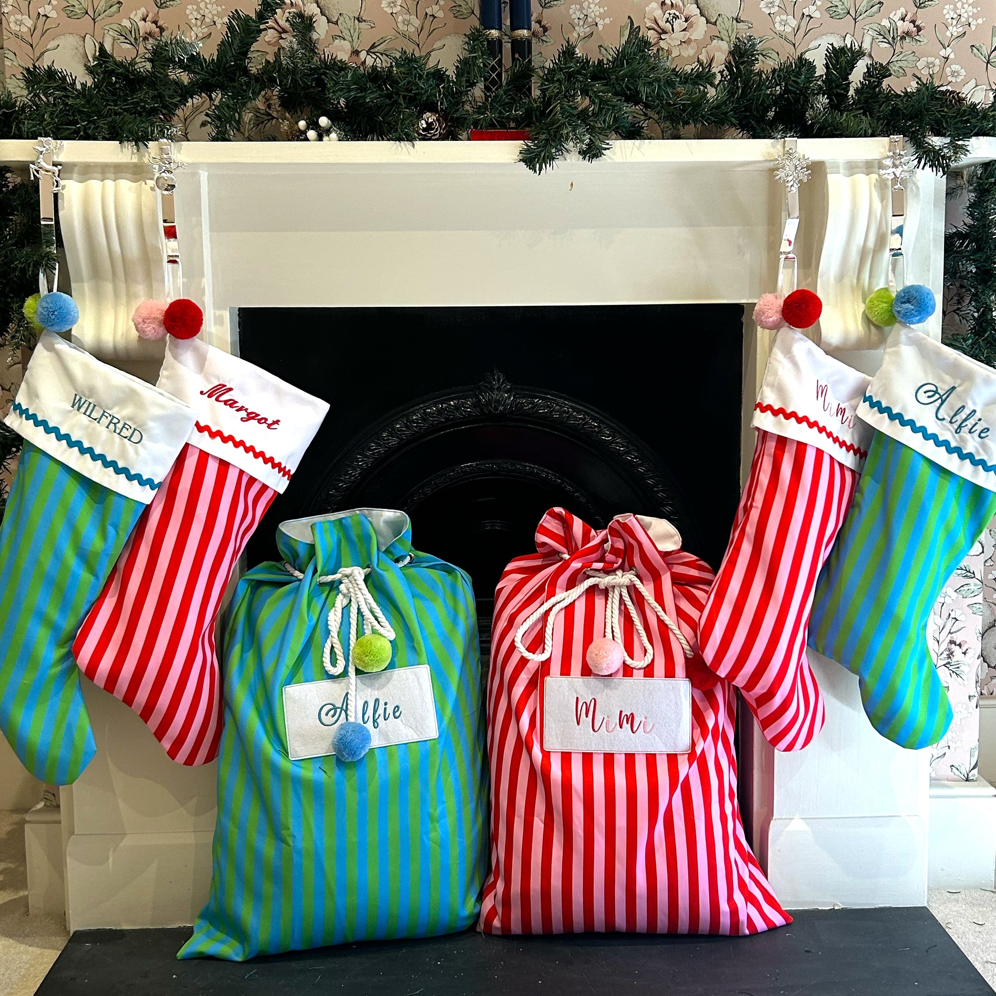 Get ready to make Santa's night at your house even more special with our colourful and bespoke luxury striped Christmas stockings! Choose from a playful blue and green combo or a vibrant pink and red. These generously sized stockings are lined with durable canvas and can be used as festive home decor or for the traditional Christmas Eve surprise from Santa. Made with top-quality materials, these sacks will surely become a cherished family keepsake.