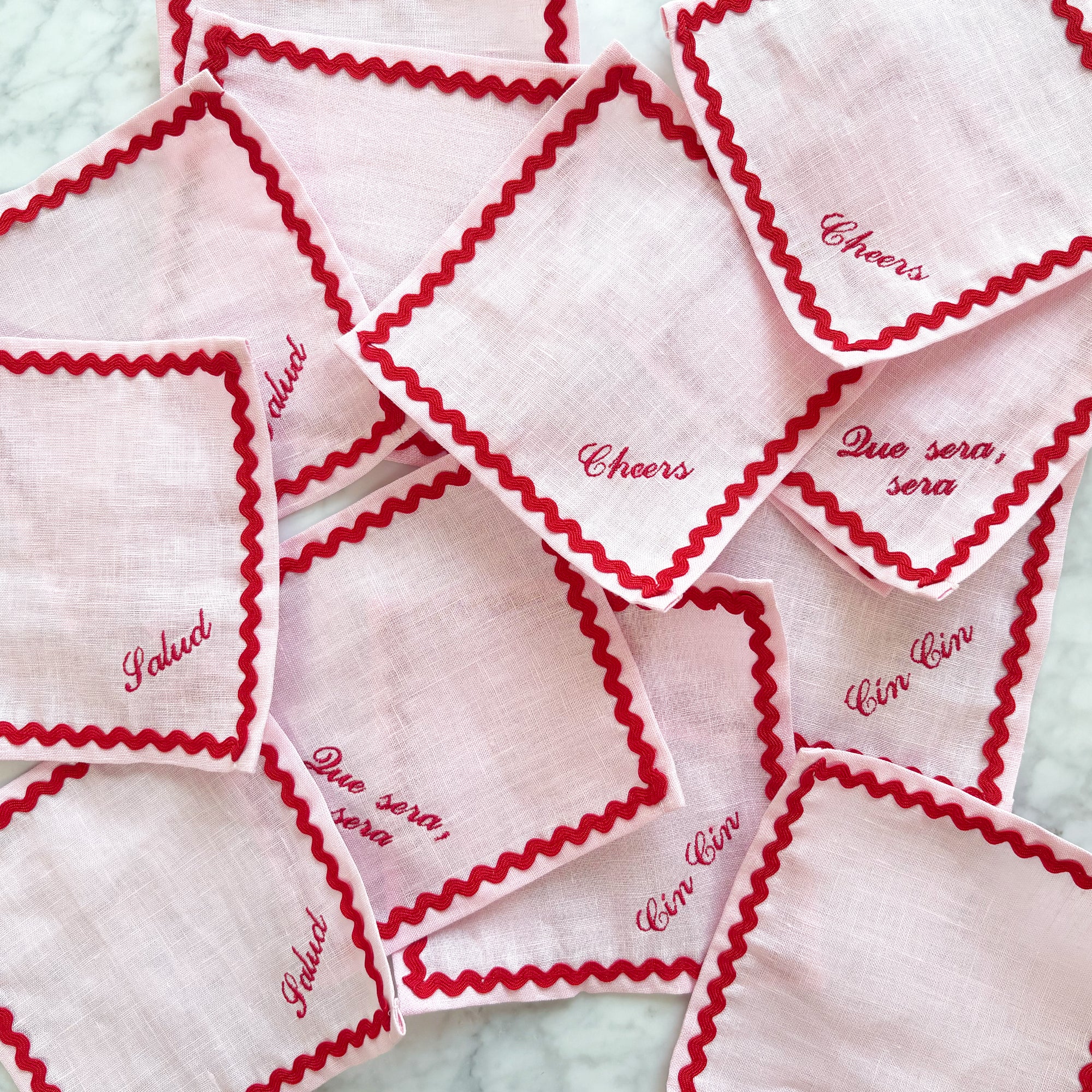 Make your table setting truly special with our Personalised Pink and Red Linen Napkin Set! Featuring charming ric rac trim and personalized monogram embroidery, these napkins add a touch of elegance to any occasion. Crafted from high-quality linen, they're not only durable but also reusable, making them a thoughtful and sustainable gift for weddings, parties, or any special event. Elevate your table decor with these personalized napkins that bring a unique flair to your dining experience. Surprise a loved one with a custom monogrammed gift or add a personalized touch to your wedding party table decor. Make every meal memorable with our Personalised Pink and Red Linen Napkin Set!