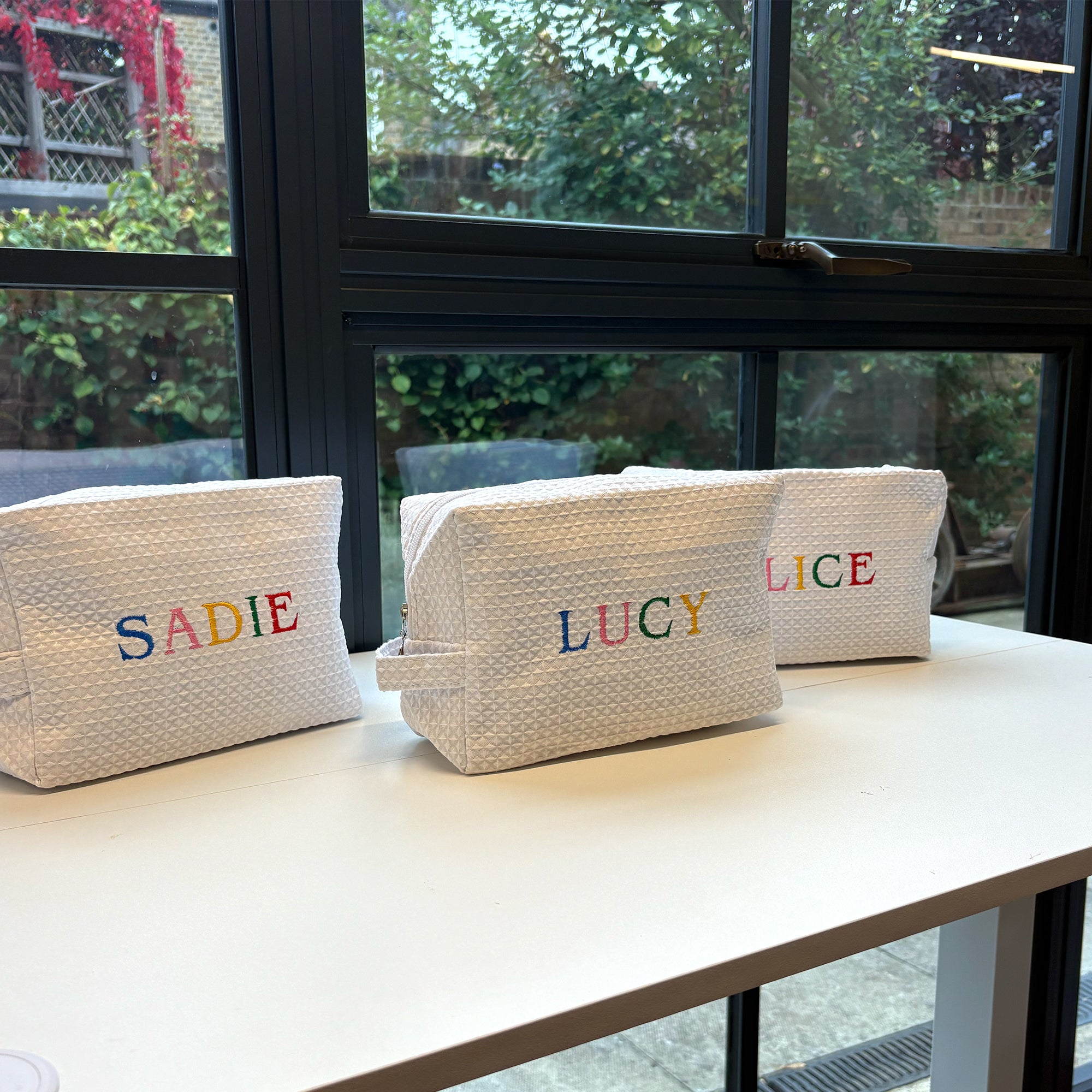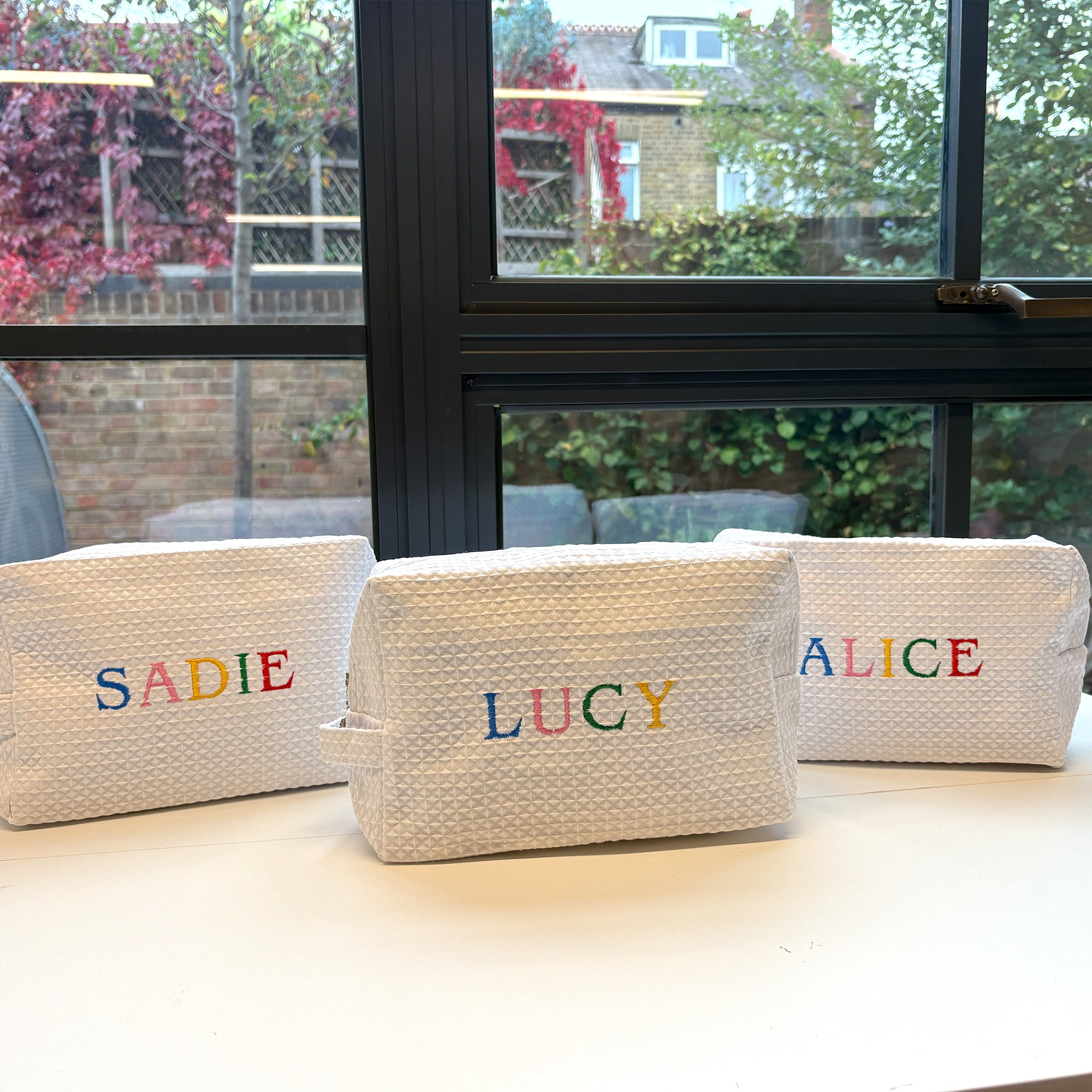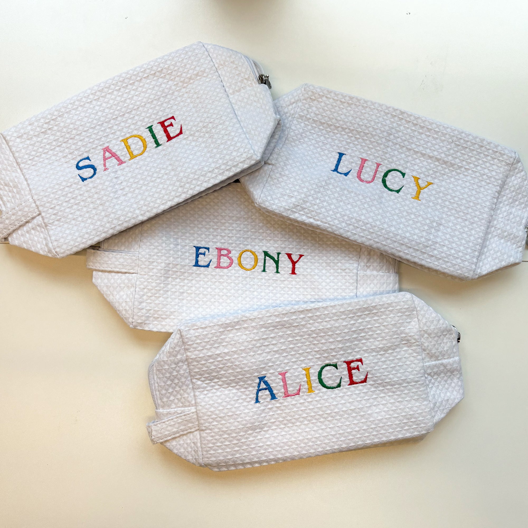 Indulge in girly charm with our white waffle Monogrammed Makeup Bag! Personalized with your name, this delightful cosmetic pouch is perfect for bridal showers, weekend getaways, or as a sweet Mother's Day surprise. Adorned with vibrant candy stripes and your custom monogram, it's both stylish and practical. Treat yourself or a loved one to a touch of luxury with our Personalized Name Cosmetic Pouch. Organize your beauty essentials in style and make every day feel like a celebration!